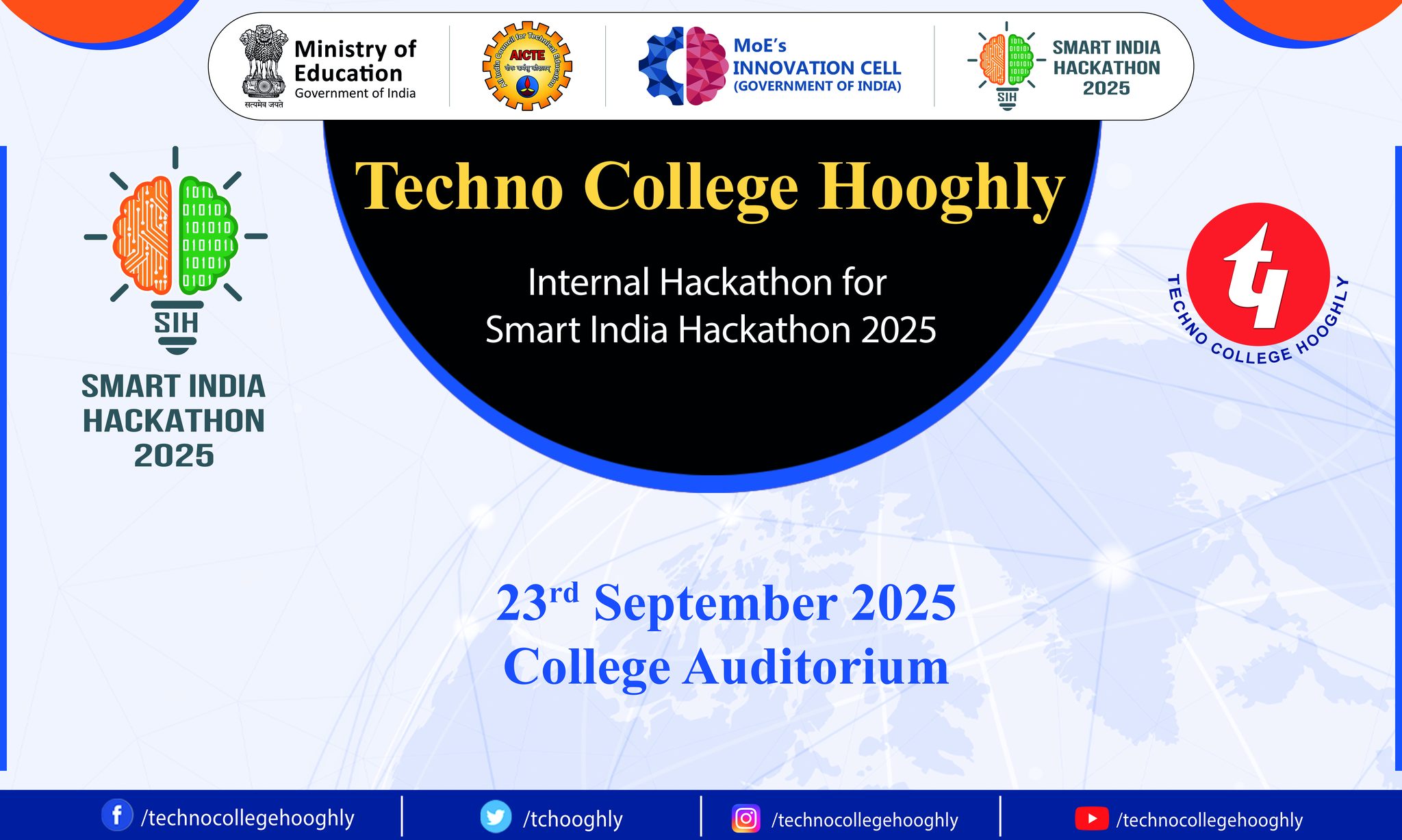 Techno College Hooghly is proud to announce the Smart India Hackathon 2025 – Internal Hackathon, scheduled to be held on 23rd September 2025 at the College Auditorium.